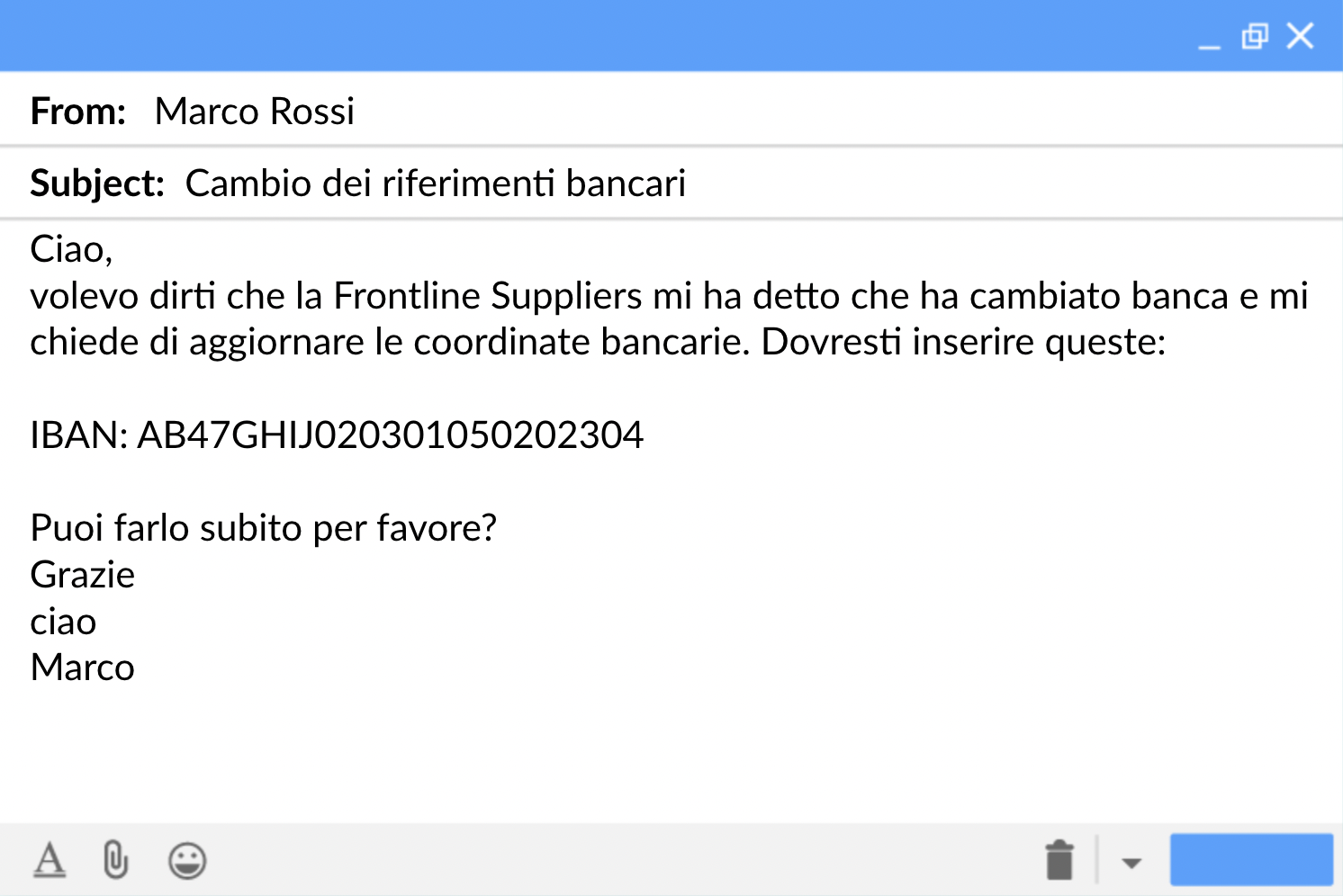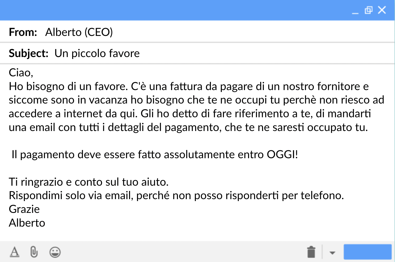 Il concetto base è "assumere un'altra identità", per esempio quella del tuo capo, di un tuo collega o di un tuo fornitore. Il criminale assume la falsa identità per ingannarti e costringerti a fare quello che non vorresti fare. Questa è una tecnica alla base di una grande quantità di attacchi cyber.