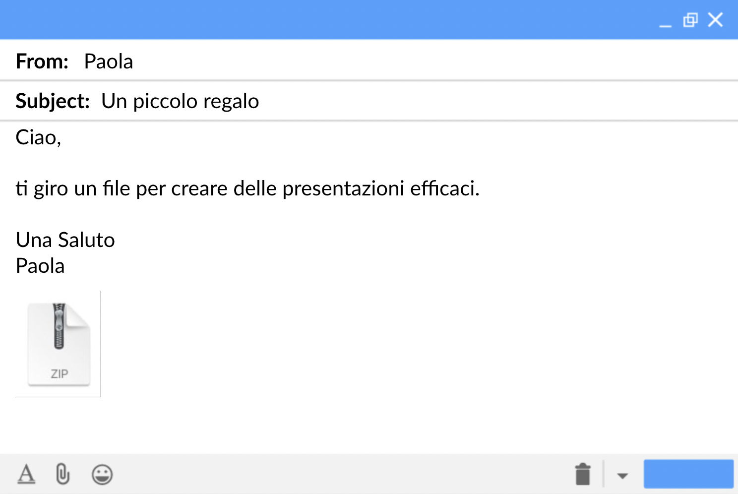 L'email è il principale mezzo con cui un malware entra in un computer o in un sistema aziendale. Il malware viene allegato alla email. La vittima che apre l'allegato, lo attiva permettendogli di agire all'interno del sistema.
