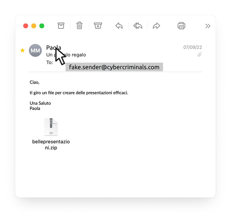 Impara a riconoscere e a diffidare di email "strane" che arrivano da mittenti conosciuti. Nel caso controlla l'indirizzo del mittente cliccandoci sopra e verifica che non nasconda un indirizzo differente.